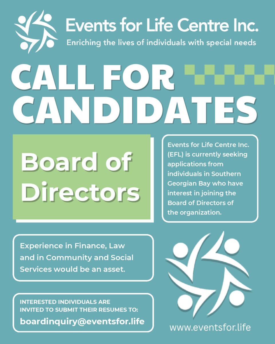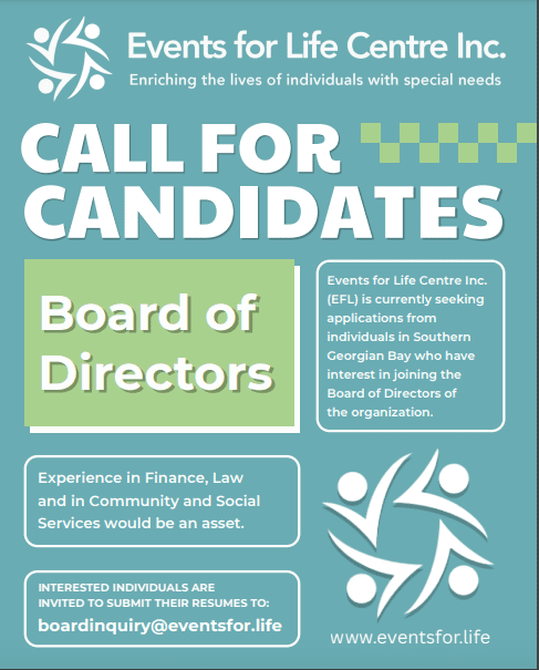Events for Life Centre Inc. (EFL) are looking for passionate individuals in Southern Georgian Bay to join the Board of Directors!