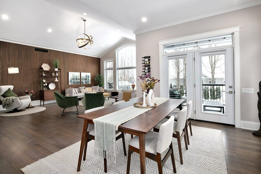 The main floor boasts an open-concept design with soaring 10ft cathedral ceilings, floor-to-ceiling windows in the great room, and a striking wood-panelled feature wall. The chefs kitchen features built-in appliances, beautiful granite countertops, a breakfast bar, and a spacious pantry. A dedicated dining space with a walkout to a covered back deck makes entertaining seamless.