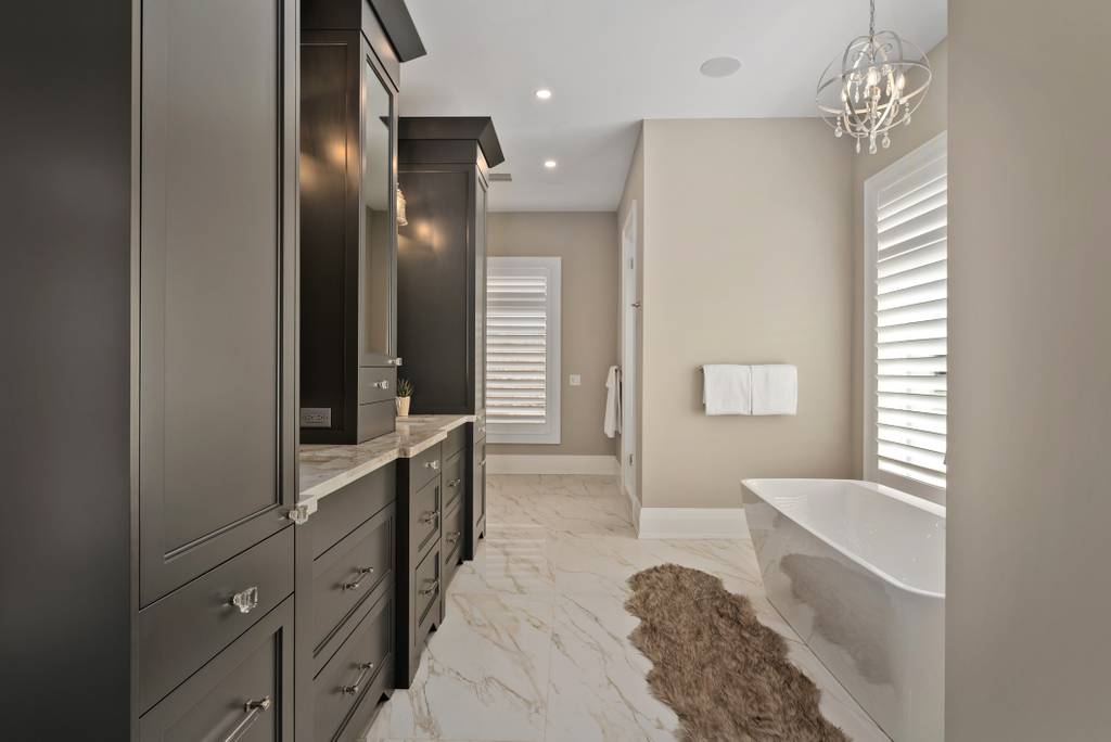 The spacious primary suite features Escarpment views, custom drapery, Napoleon gas fireplace, walk-in closet with built-ins and 2 walk-outs with access to the patio areas, one of which has a hot tub. The spa-like 5pc ensuite boasts heated floors, freestanding tub, built in storage and natural stone countertops.