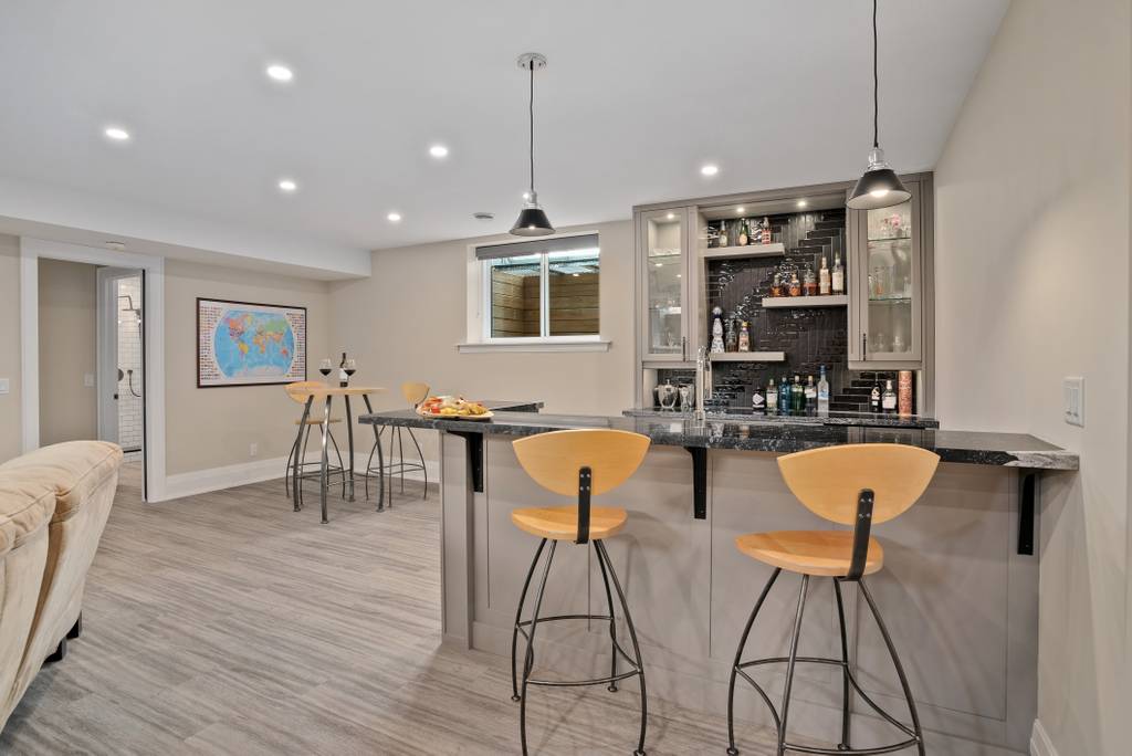 Head down the glass railing stairs to a large lower level space, an ideal area for guests. You’ll find a bedroom, 3pc bathroom, wet bar, big windows for lots of natural light, rec room with surround sound and ample space for a pool table. Entertain family and friends at the wet bar that includes a bar fridge, dishwasher and natural stone countertops.