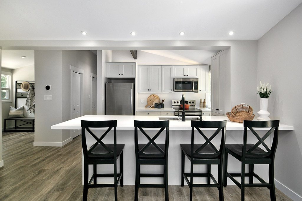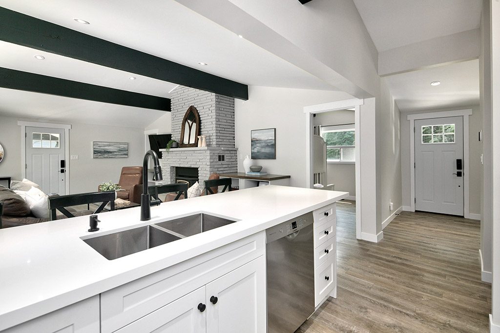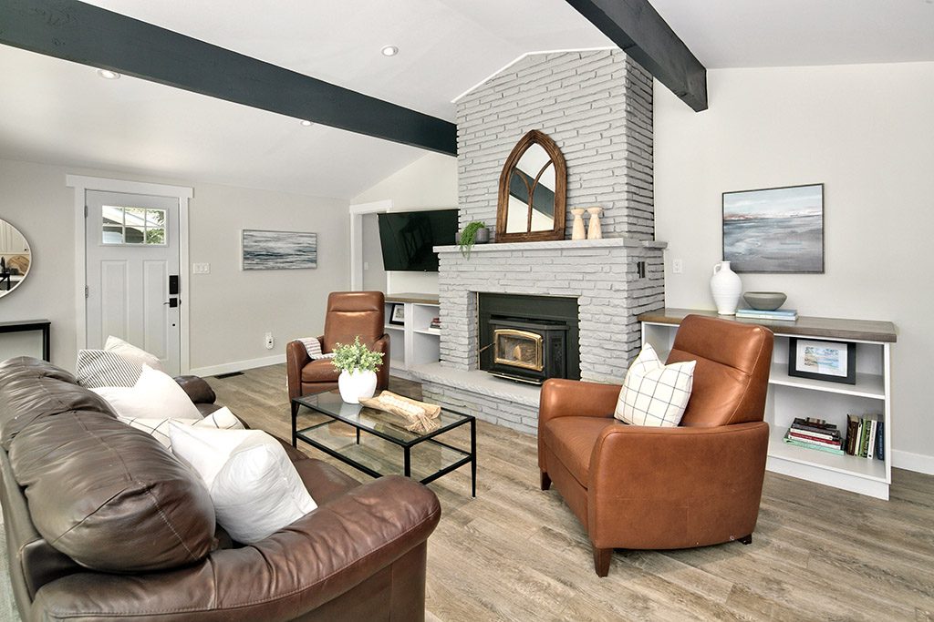 The open concept living room welcomes you with its warmth, highlighted by a wood-burning fireplace that sets the mood for cozy evenings. The white kitchen features sleek white quartz countertops and black hardware, adding a touch of modern elegance to the space.