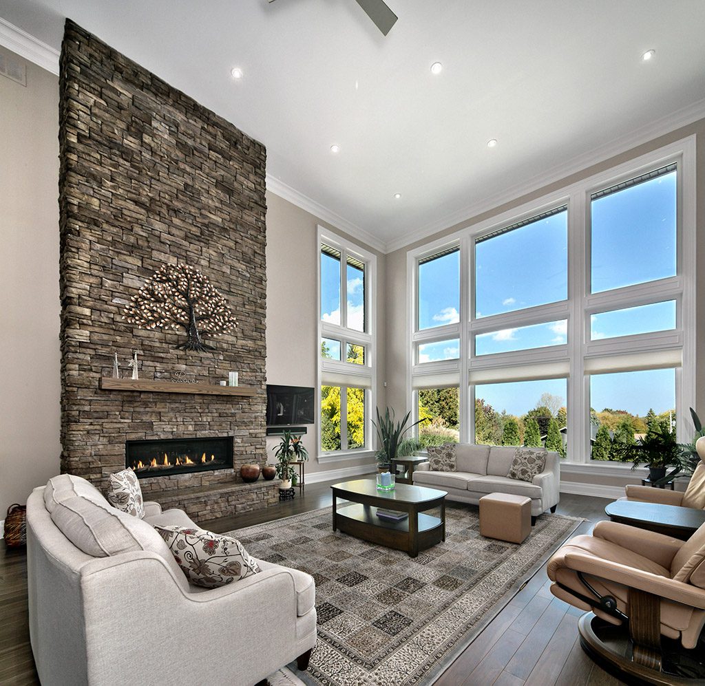 The great room is a focal point with floor-to-ceiling windows, a striking stone surround gas fireplace, and abundant natural light. Additionally, the main floor features a large primary suite with 5pc ensuite bath with heated floors and walk in closet, convenient laundry/mudroom with access to the oversized 2-car garage. & guest bedroom.