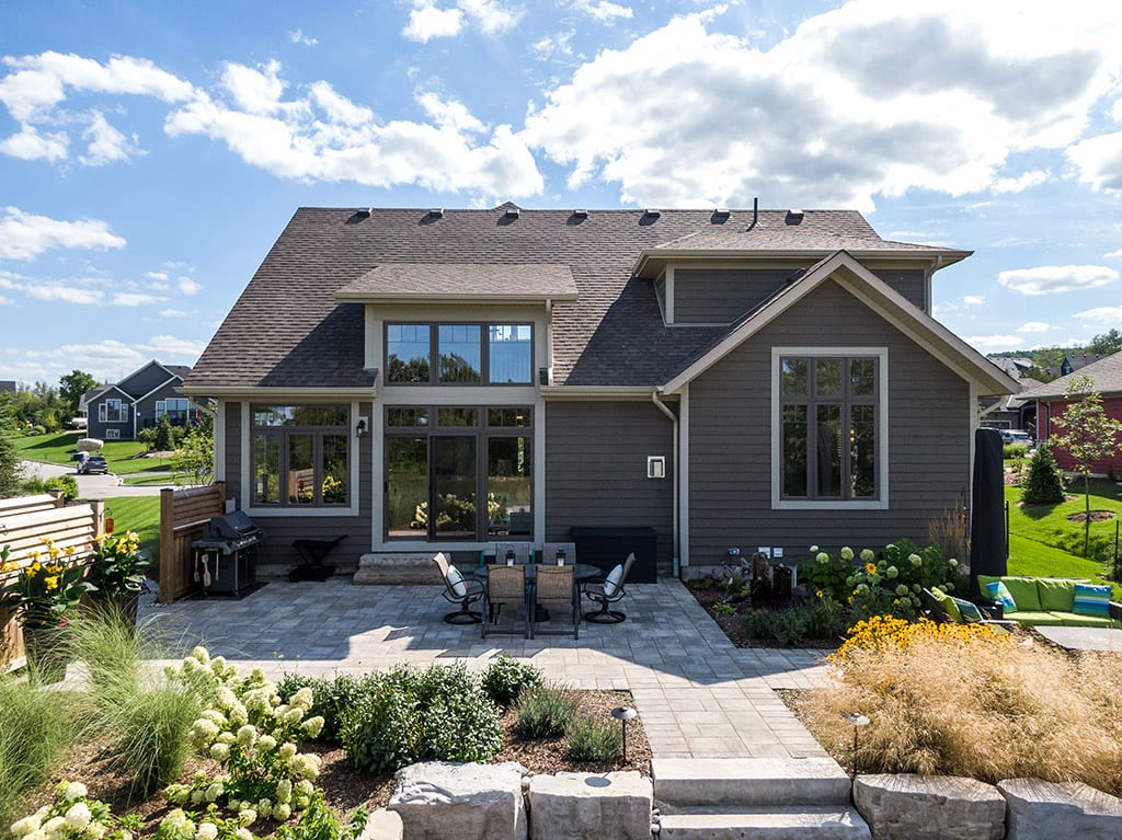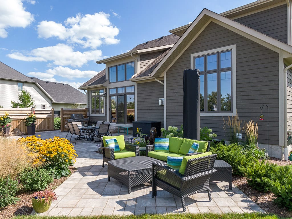 Outside features extensive landscaping done by Oasis North including beautiful flowering gardens, outdoor lighting, high end stone fire table in sunken separate patio, multiple patio areas, fountain water feature, natural stone window wells, all with bay and golf course views and a 2 car garage.