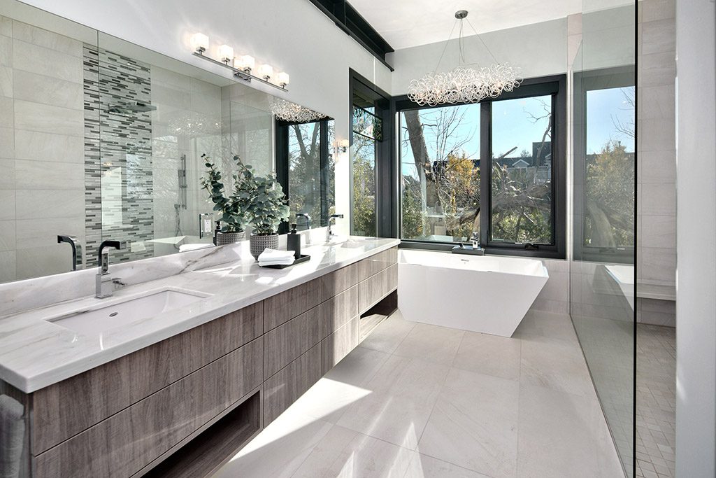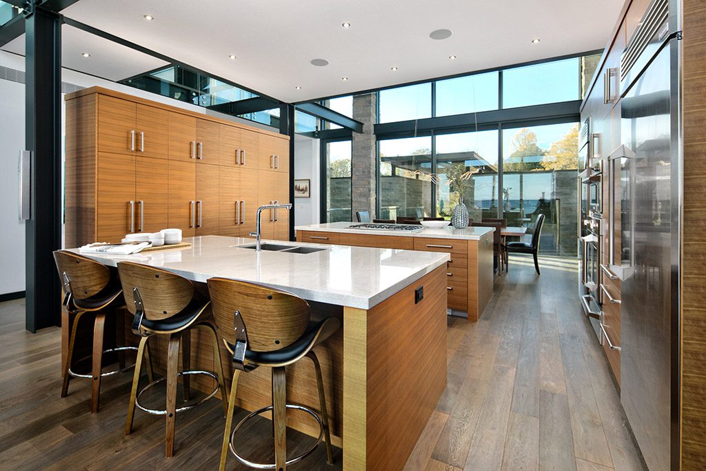The chef’s kitchen boasts ample space for entertaining, natural wood cabinets, white quartz countertops, dual islands and a separate bar space. The larger high end appliances are tucked away into the side cabinets so as not to obstruct the most important part of this home; the views. The dining space features an area for a large table, designer lighting and a view of the show stopping glass front garage, which can also be seen from the backyard. The great room has a modern gas fireplace and sliding glass doors leading out to the gorgeous al fresco patio area.