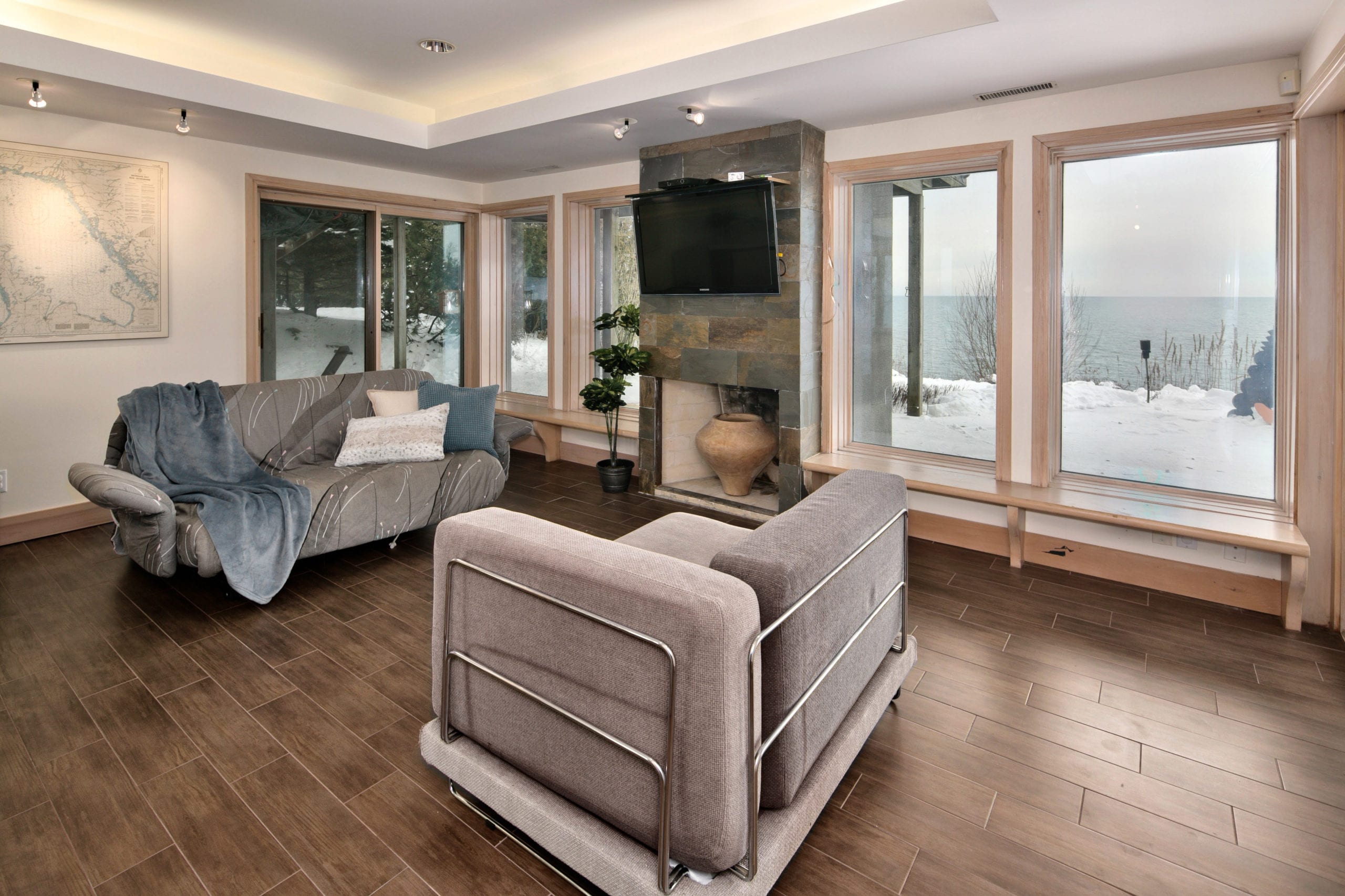 The cottage has been designed with Bay views in mind and features open concept main floor living with cathedral ceilings, floor to ceiling windows that accentuate the glistening Bay views, kitchen with breakfast bar, walk out to a large deck and a spacious master suite looking out to the Bay. In the walk out lower level you’ll find 2 bedrooms & a den/playroom with stunning views of the Bay. A 4pc bathroom and a spa area that includes a gym, sauna and wine cellar complete the lower level.
