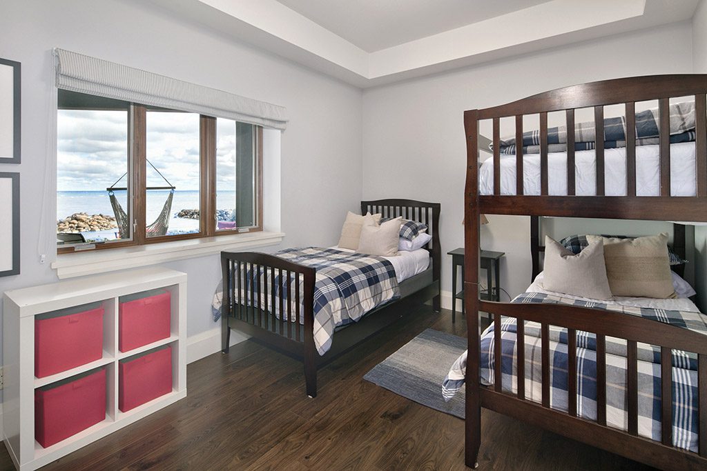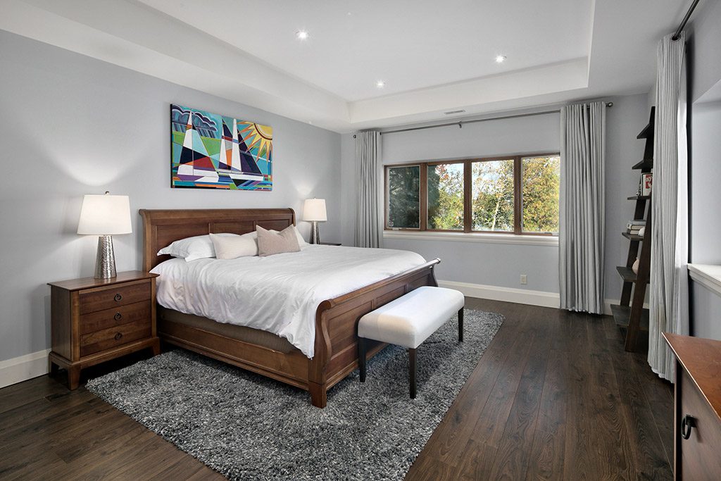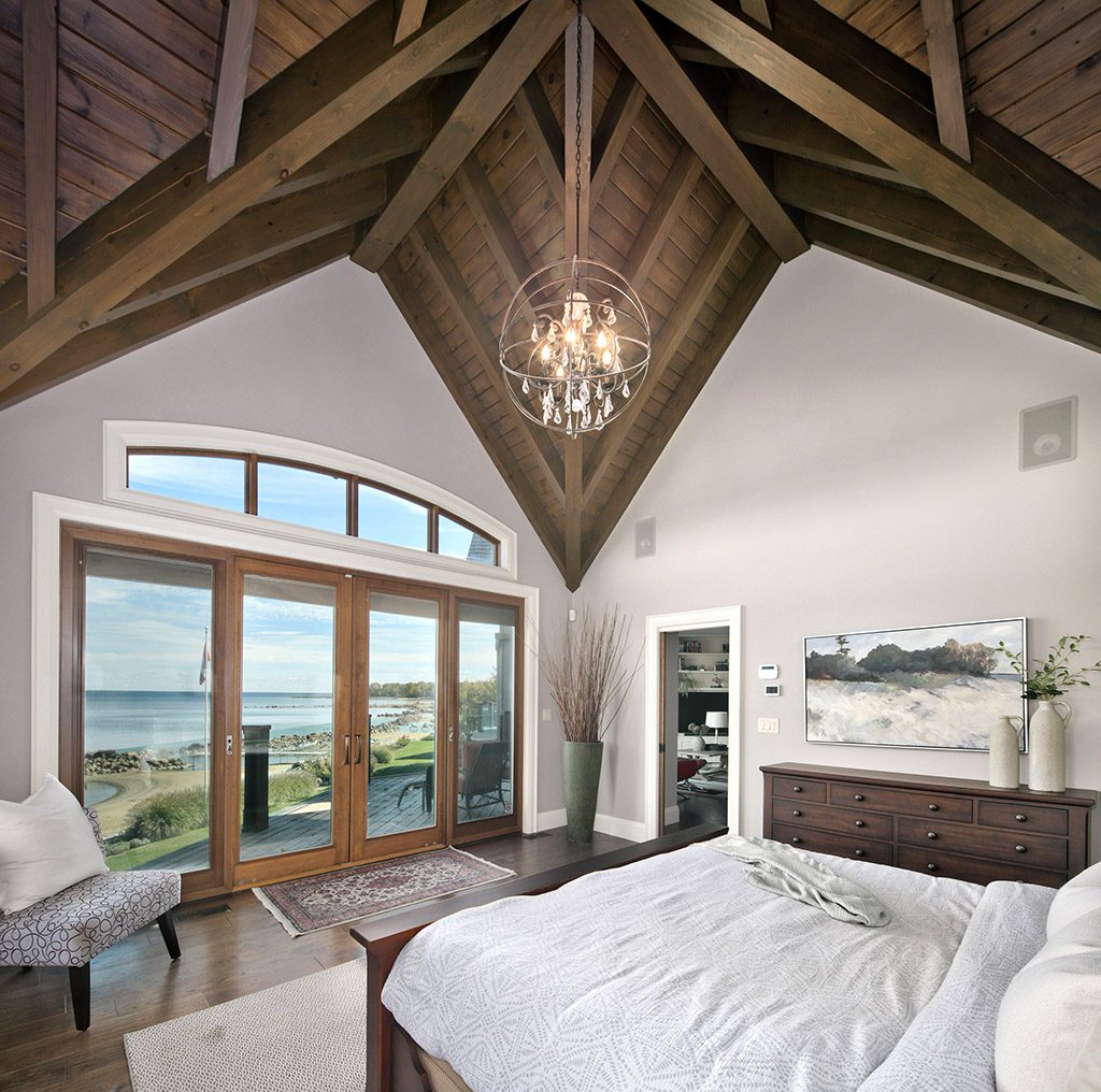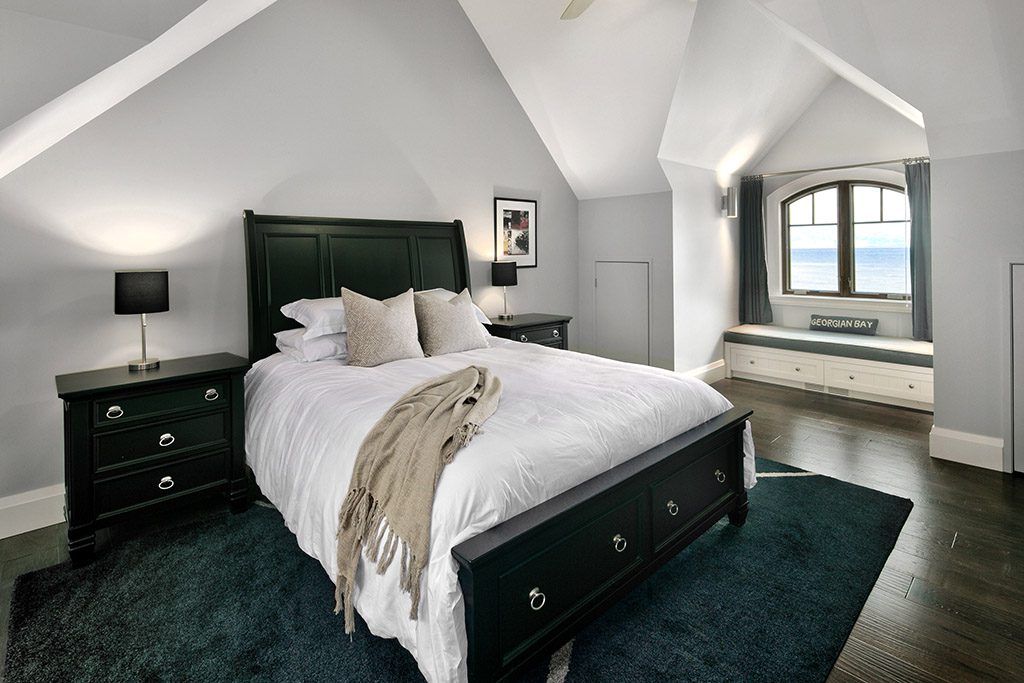 The primary suite, tucked into its own private wing, offers a peaceful escape. Enjoy a cozy sitting room with gas fireplace, 15.8ft ceilings in the main bedroom, serene water views, a walk-in closet, and a private deck overlooking the bay. The spa-inspired ensuite with luxury marble counters completes this tranquil suite.