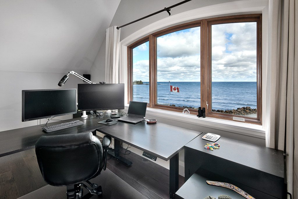 Functionality meets refinement with a spacious laundry and mudroom, dog wash station, and direct access to the 3 level garage with built-in storage and mezzanine. Upstairs, two guest bedrooms, two beautiful 3-pc bathrooms, a flex space and a home office with bay views provide space for everyone.