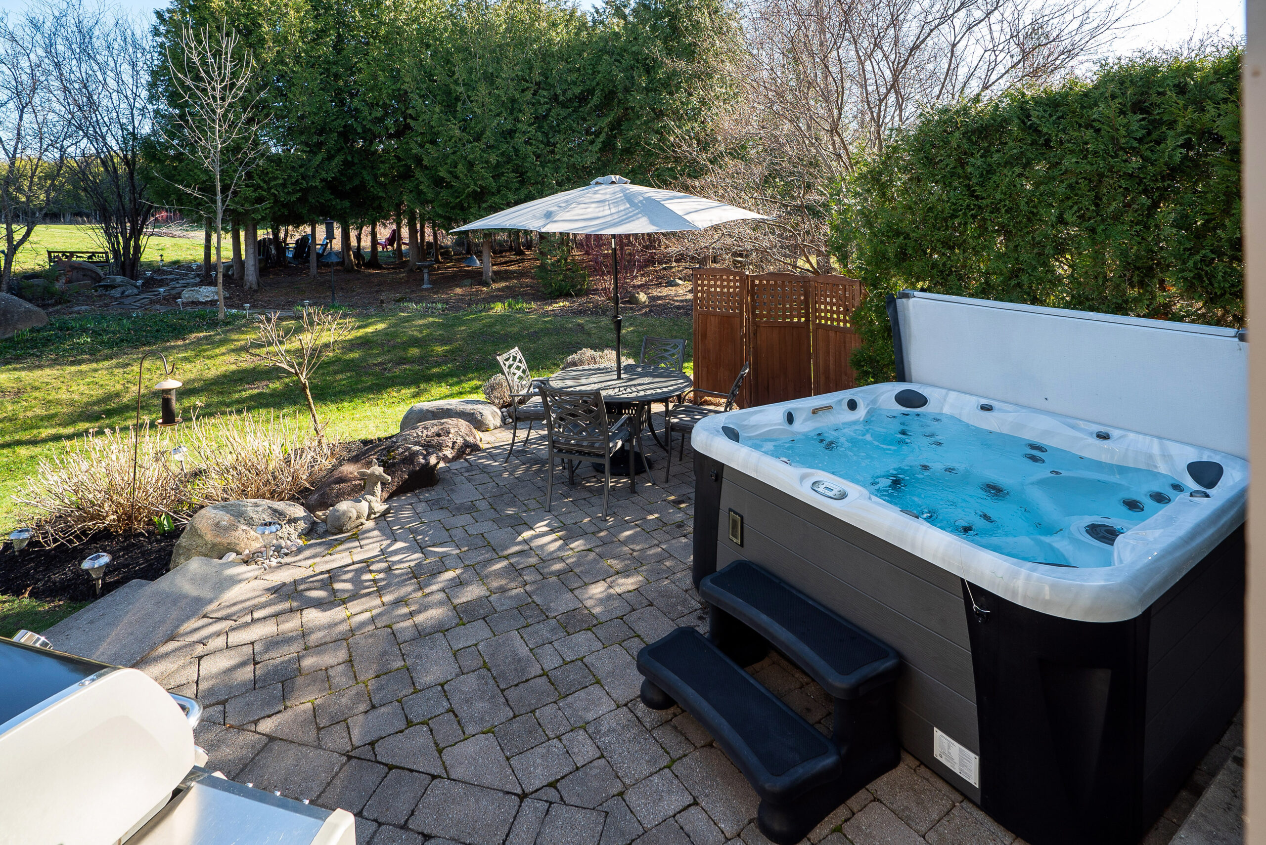 Step into the spacious open concept layout, highlighted by a soaring cathedral ceiling in the living room and large windows. French patio doors lead to a backyard oasis with southern exposure, providing a private sanctuary for outdoor enjoyment. The kitchen features high end appliances, granite counters and island, great for hosting! The formal dining room offers space to entertain guests after a day of exploring the area. The main floor primary suite boasts an ensuite bathroom with shower that converts into a steam room, walk in closet and sliding doors leading out the patio area with hot tub.