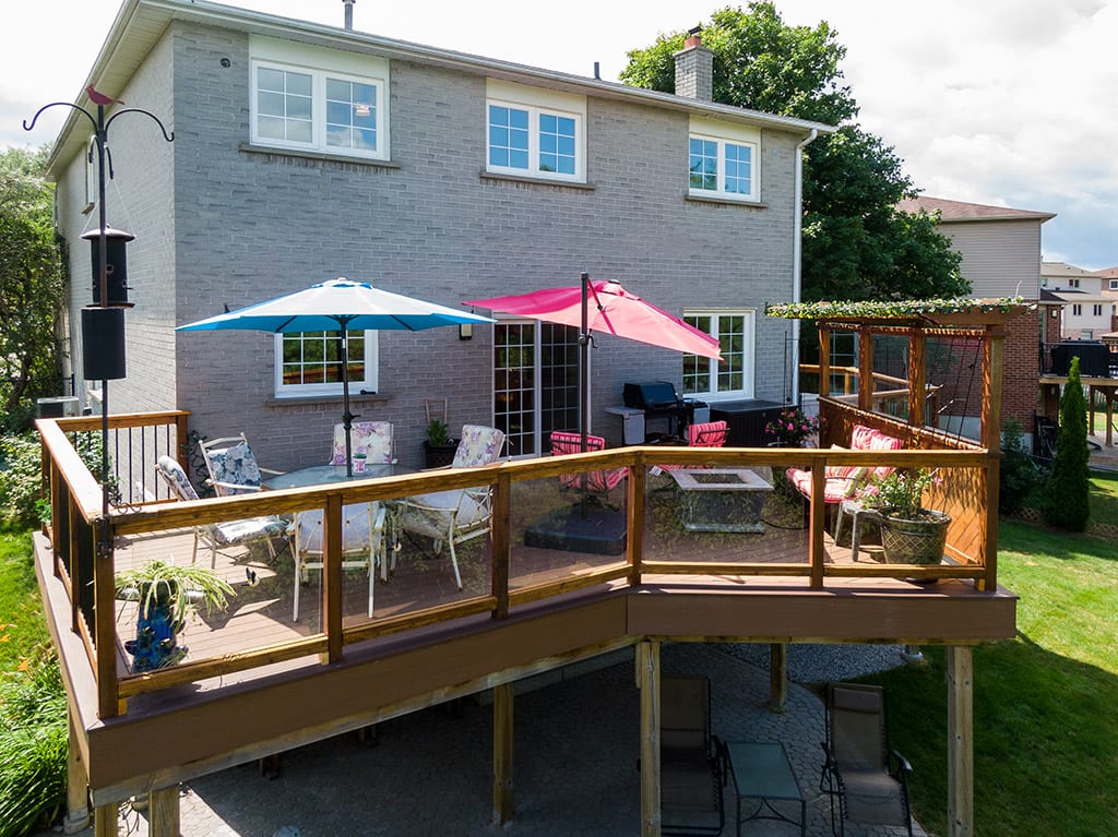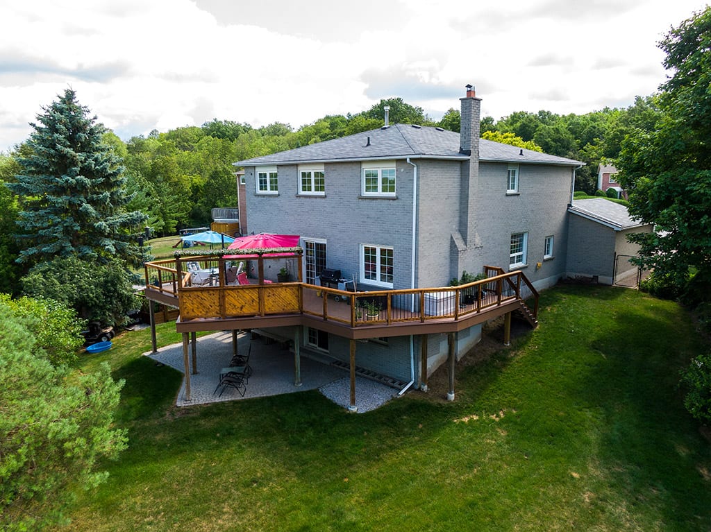 The exterior offers a brand new roof (2020), 15 new window panes, extensive brick updates and private fully fenced backyard backing onto a green belt/conservation area with a raised garden and shed. The composite upper deck has modern glass railings and is ideal for entertaining with views of giant, mature trees surrounding the property. The interlocking stone drive is the only one on the court and compliments the attractive exterior of the home.
