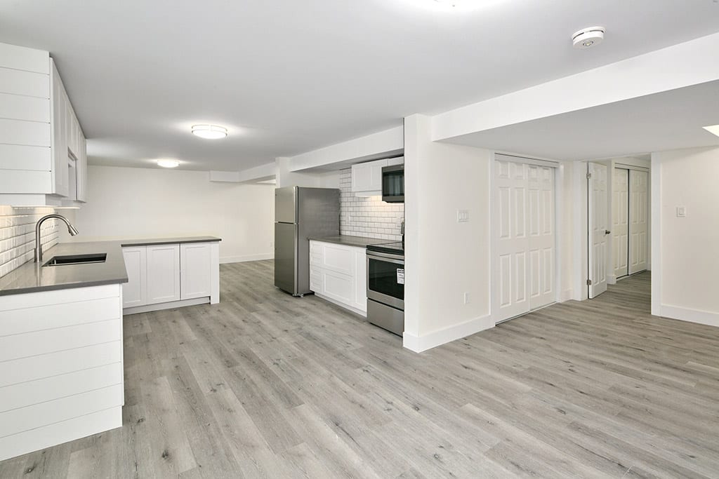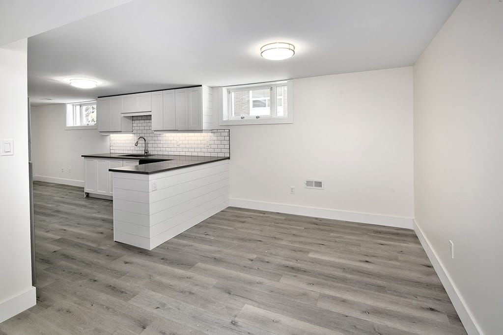 The main floor features luxury vinyl flooring, modern light fixtures and an open concept new kitchen/living space (2021) with quartz counters, stainless steel appliances and a peninsula. The bright living area has large windows and opens to the foyer where you’ll find a laundry closet. Also in this apartment, there are 3 good sized bedrooms, all with plenty of closet space and they share a 4pc bathroom.